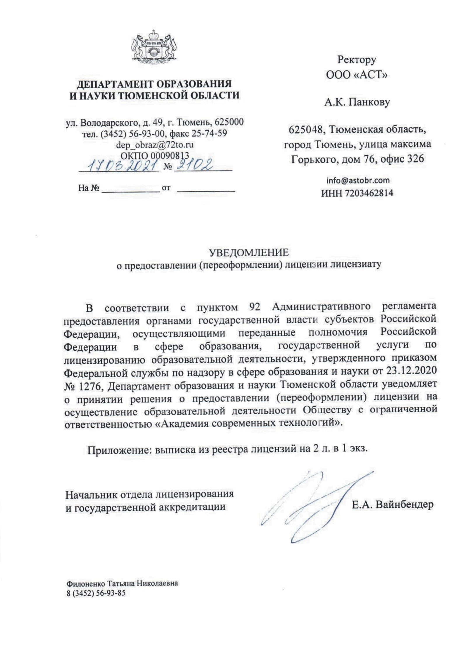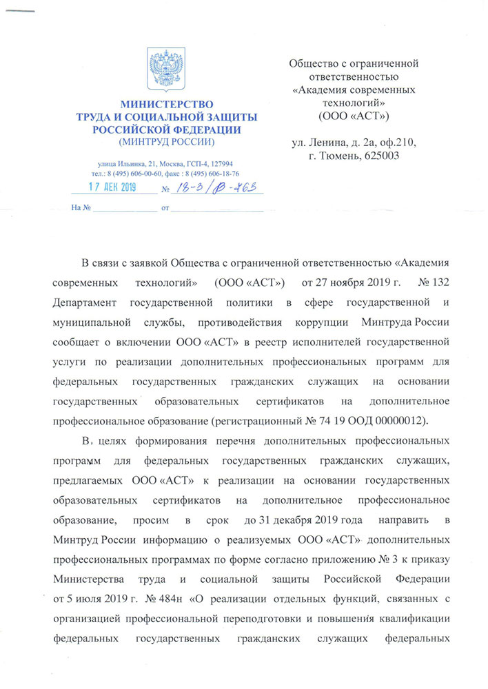 • Письмо о регистрации ООО «Академия Современных Технологий» в ФРДО