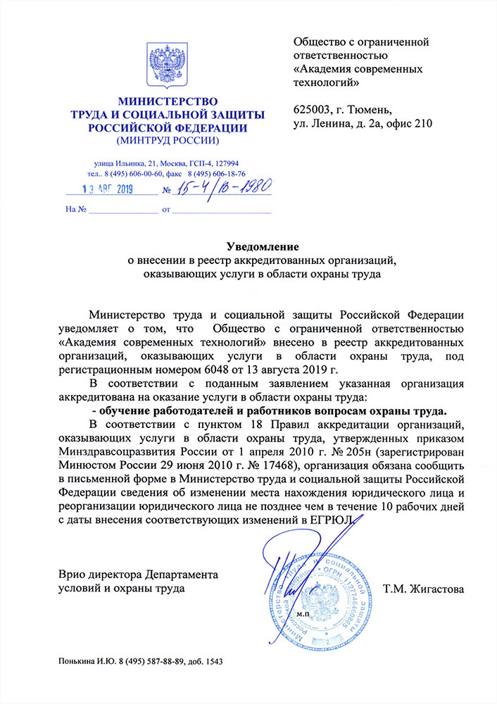 • Уведомление ООО «Академия Современных Технологий» о внесении в реестр аккредитованных организаций, оказывающих услуги в области охраны труда (стр. 1)